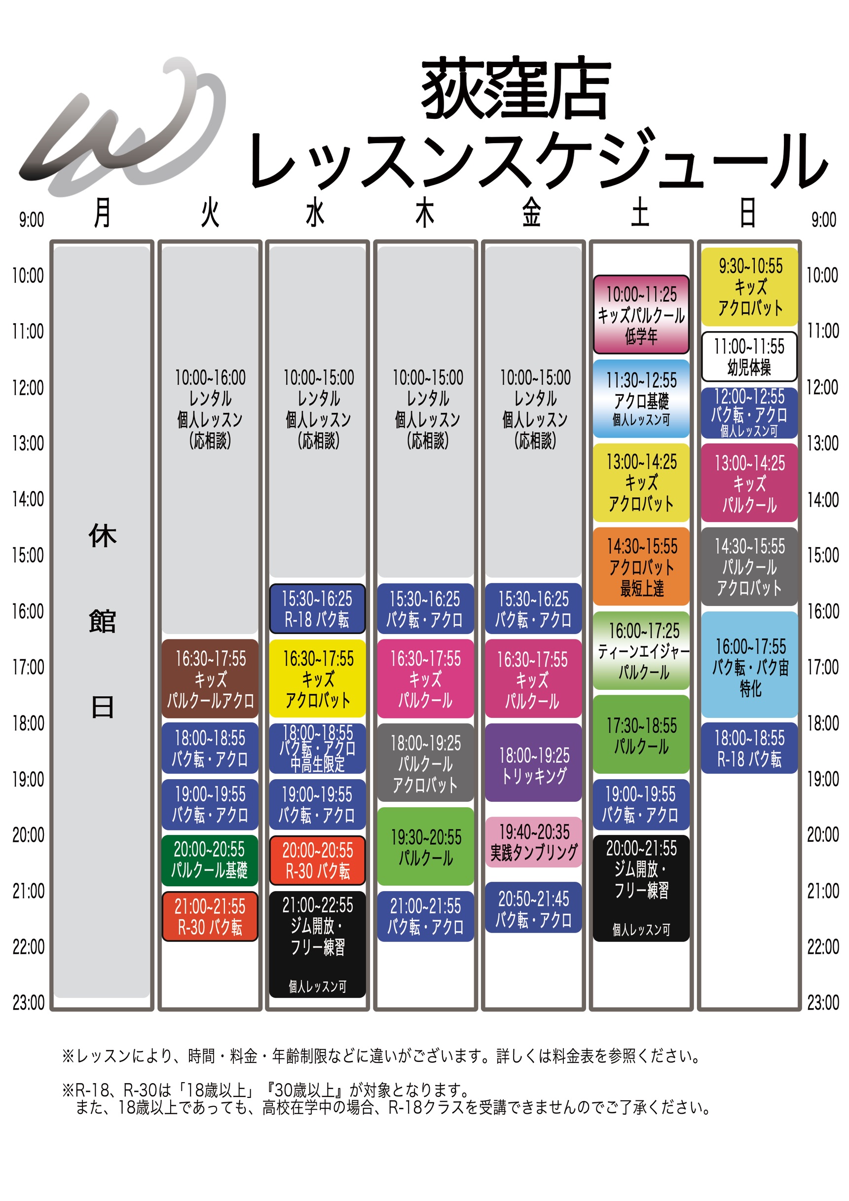 いつもアクロバットジム ホワイトをご利用いただき、誠にありがとうございます。急なお知らせとなり大変恐縮ではございますが、表題の通り2026年3月より荻窪店は毎週月曜日を休館日に設定させていただきます。受講者様には多大なるご迷惑をお掛け致しますが、何卒ご了承頂けますようよろしくお願い申し上げます。